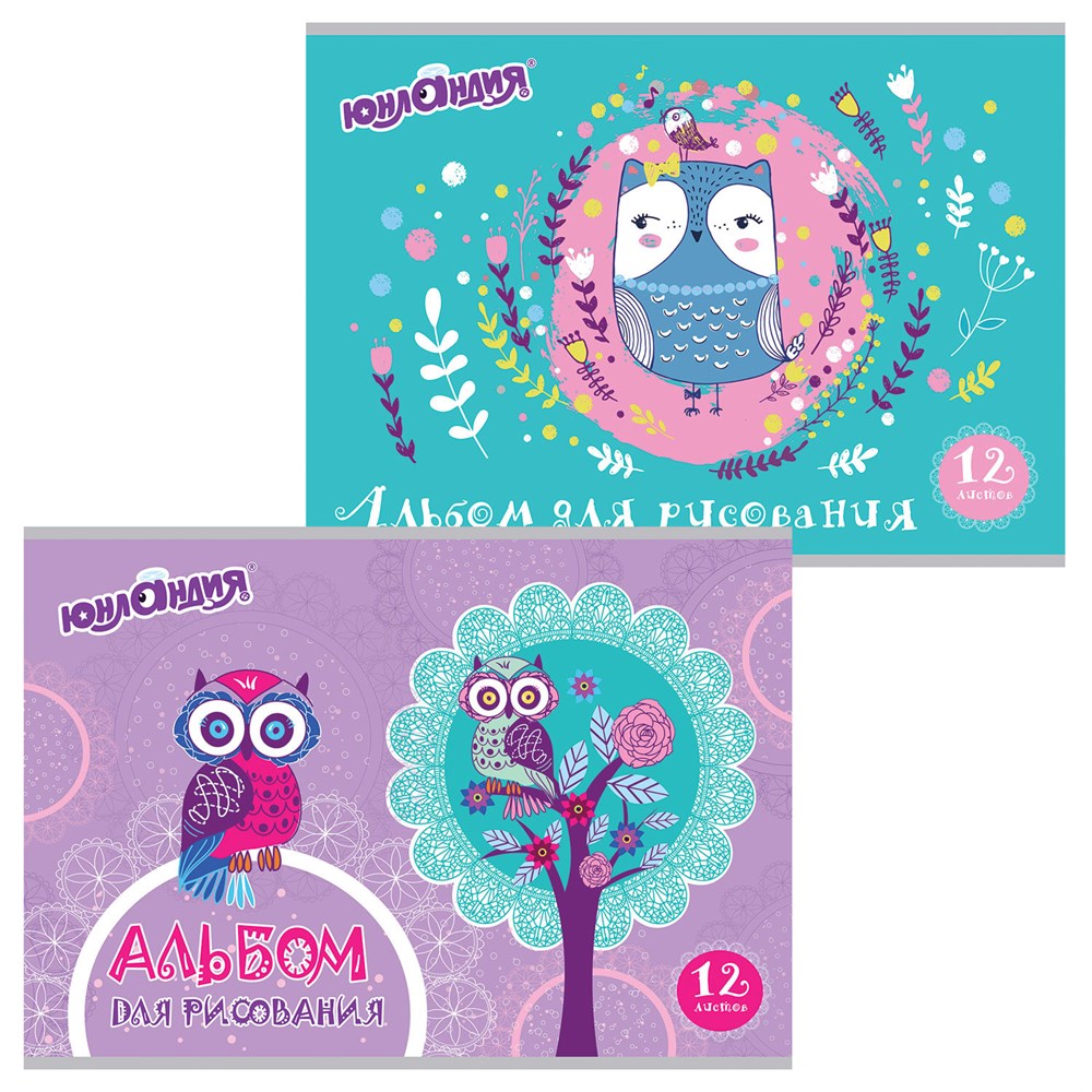 Альбом для рисования, А4, 12 листов, скоба, обложка картон, ЮНЛАНДИЯ, 200х283 мм, "Волшебные птички" (2 вида), 105044