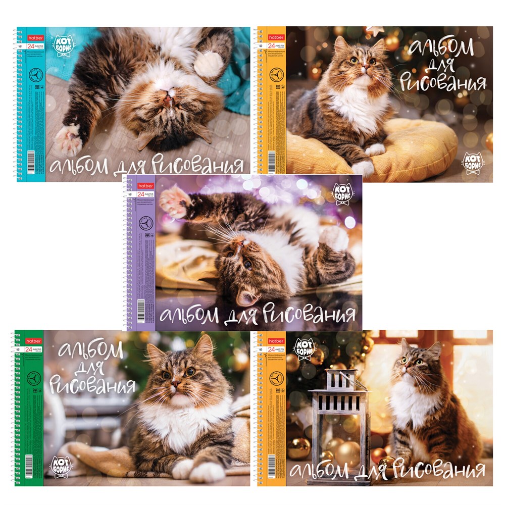 Альбом для рисования А4 24 л., спираль, обложка картон, HATBER, 198х300 мм, "Кот Борис" (5 видов), 079771, 24А4Всп
