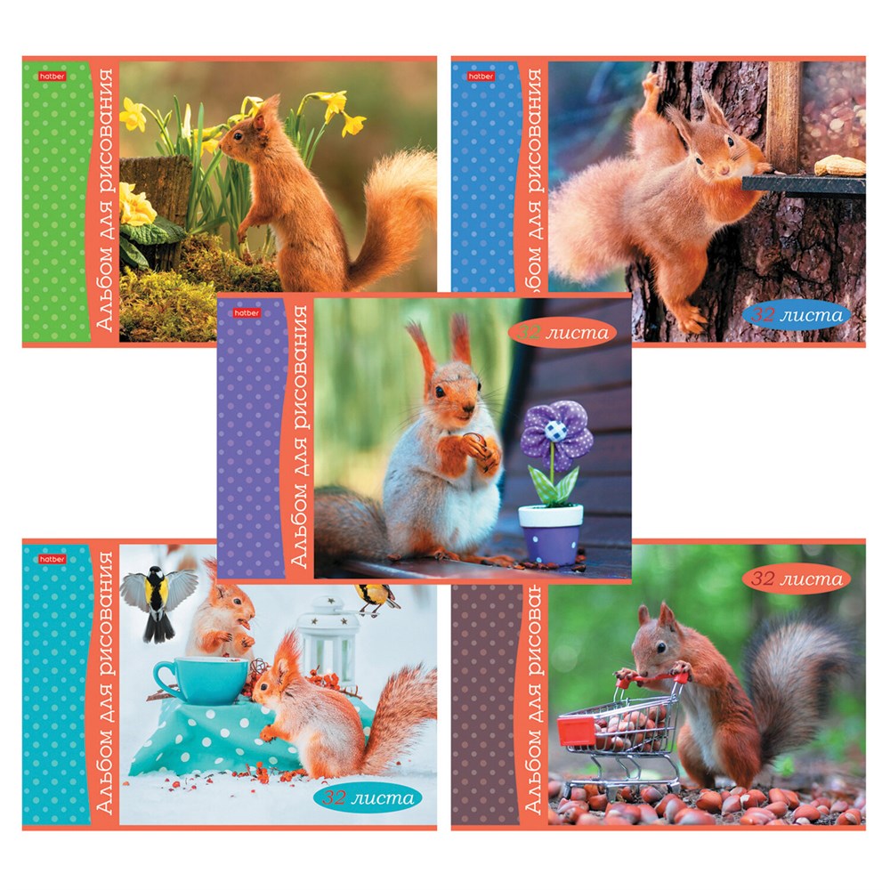 Альбом для рисования А4, 32 л., скоба, обложка картон, HATBER, 205х290 мм, "Белочка пришла" (5 видов), 091519, 32А4В