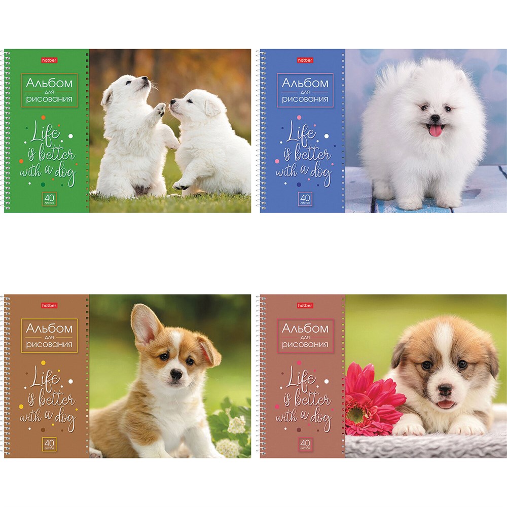 Альбом для рисования А4 40 л., спираль, обложка картон, HATBER, 205х290 мм, "Doggie-Щенки" (4 вида), 067478