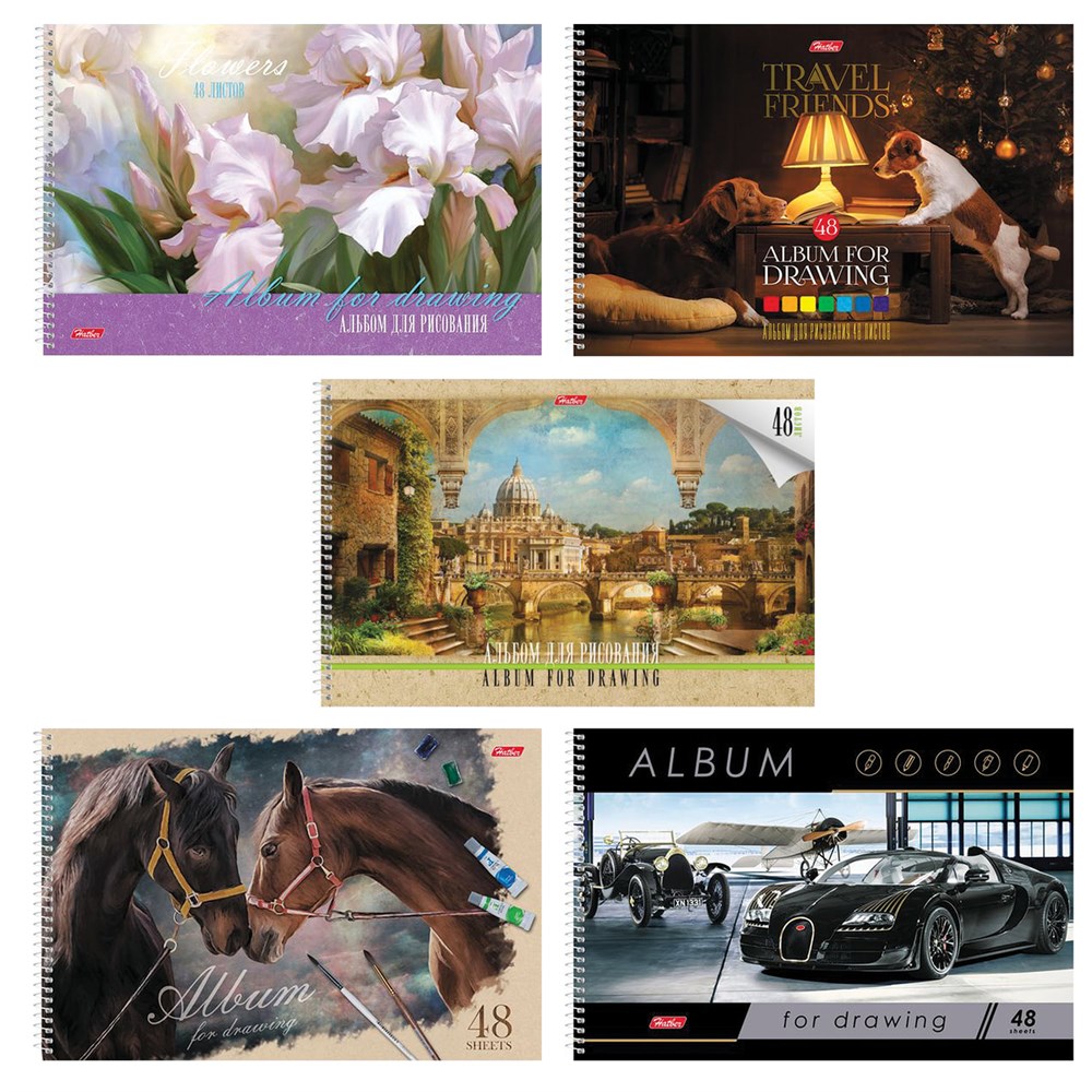 Альбом для рисования, А4, 48 листов, спираль, обложка картон, HATBER, 205х300 мм, "Ассорти (5 видов)", 051886, 48А4Всп