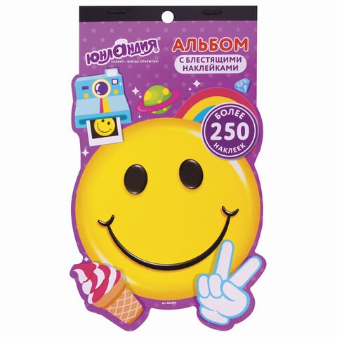 Альбом со сверкающими наклейками "Смайлики", 4 листа, более 250 шт., склейка, ЮНЛАНДИЯ, 662699