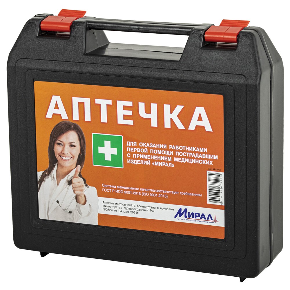 Аптечка первой помощи работникам МИРАЛ в пластиковом переносном футляре (кейсе) рассчитана на оказание помощи пострадавшим вне медицинских учреждений.Изготовлена в соответствии с приказом Министерства здравоохранения РФ от 24.05.2024 г. №262н.