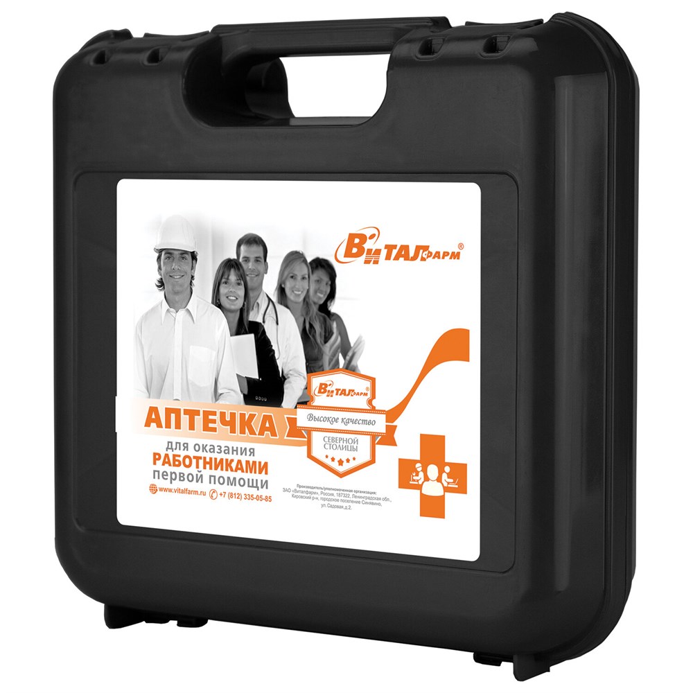 Аптечка первой помощи работникам ВИТАЛФАРМ в пластиковом переносном футляре (кейсе) рассчитана на оказание помощи пострадавшим вне медицинских учреждений.Изготовлена в соответствии с приказом Министерства здравоохранения РФ от 24.05.2024 г. №262н.