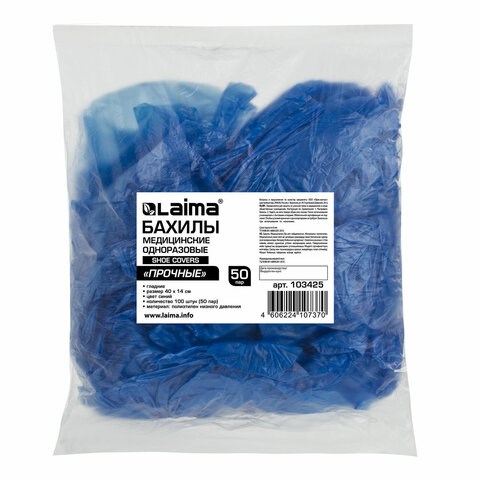 Бахилы КОМПЛЕКТ 100 штук (50 пар) в упаковке, ПРОЧНЫЕ, 40х14 см, 4 г, ПНД, LAIMA, 103425