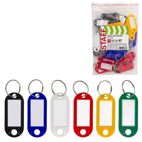 Бирки для ключей КОМПЛЕКТ 50 ШТ., длина 50 мм, инфо-окно 30х15 мм, АССОРТИ, STAFF, 237489