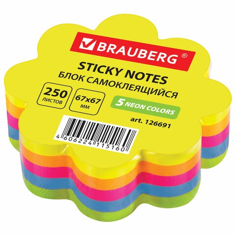 Блок самоклеящ. 67*67 мм BRAUBERG фигурный НЕОНОВЫЙ, в форме цветка, 250 л, 5 цветов, 126691