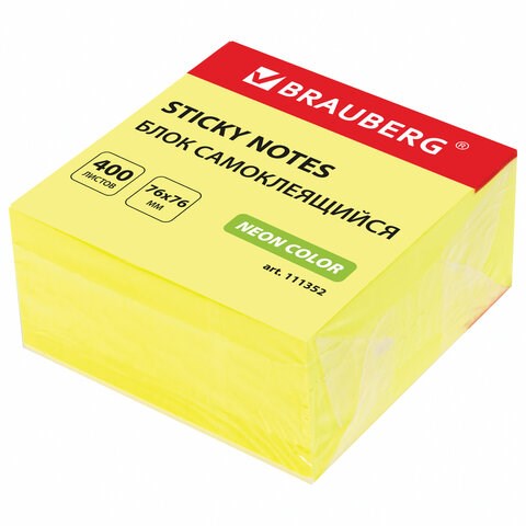 Блок самоклеящийся (стикеры) BRAUBERG НЕОНОВЫЙ 76х76 мм, 400 листов, желтый, 111352