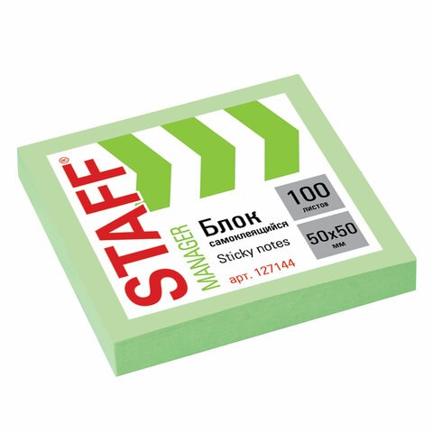 Блок самоклеящийся (стикеры) STAFF, 50х50 мм, 100 листов, зеленый, 127144