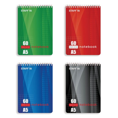 Блокнот А5 146х205 мм, 60 л., гребень, жесткая подложка, клетка, STAFF, 4 вида, 126539
