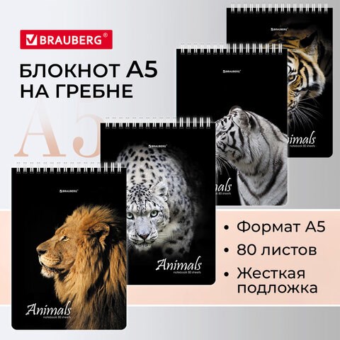 Блокнот А5 (146х206 мм), 80 л., гребень, картон, жесткая подложка, клетка, BRAUBERG, "Хищники", 114385