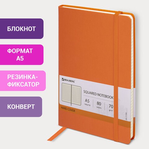Блокнот А5 (148x218 мм), BRAUBERG "Metropolis", балакрон, 80 л., резинка, клетка, оранжевый, 111584
