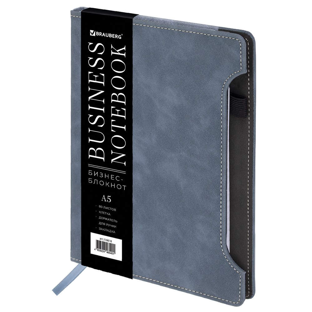 Блокнот А5 165x218 мм, BRAUBERG "Perfect", под кожу софт-тач, держатель для ручки, 80 листов, клетка, серо-синий, 116618