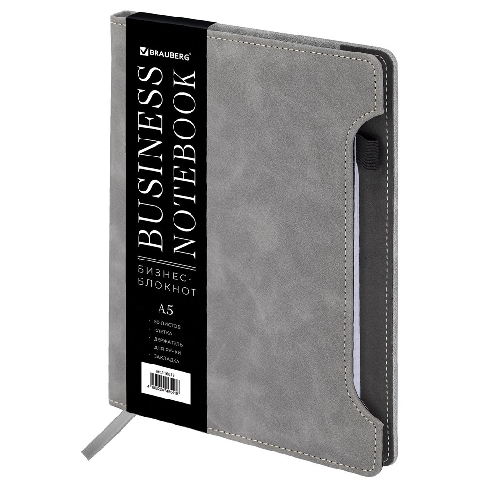 Блокнот А5 165x218 мм, BRAUBERG "Perfect", под кожу софт-тач, держатель для ручки, 80 листов, клетка, серый, 116619