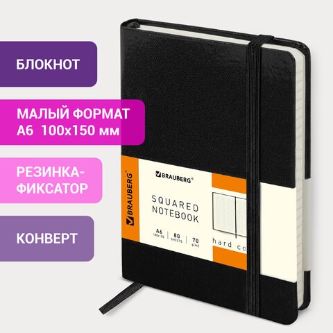 Блокнот МАЛЫЙ (100x150 мм) А6, BRAUBERG "Metropolis", балакрон, резинка, клетка, черный, 111589