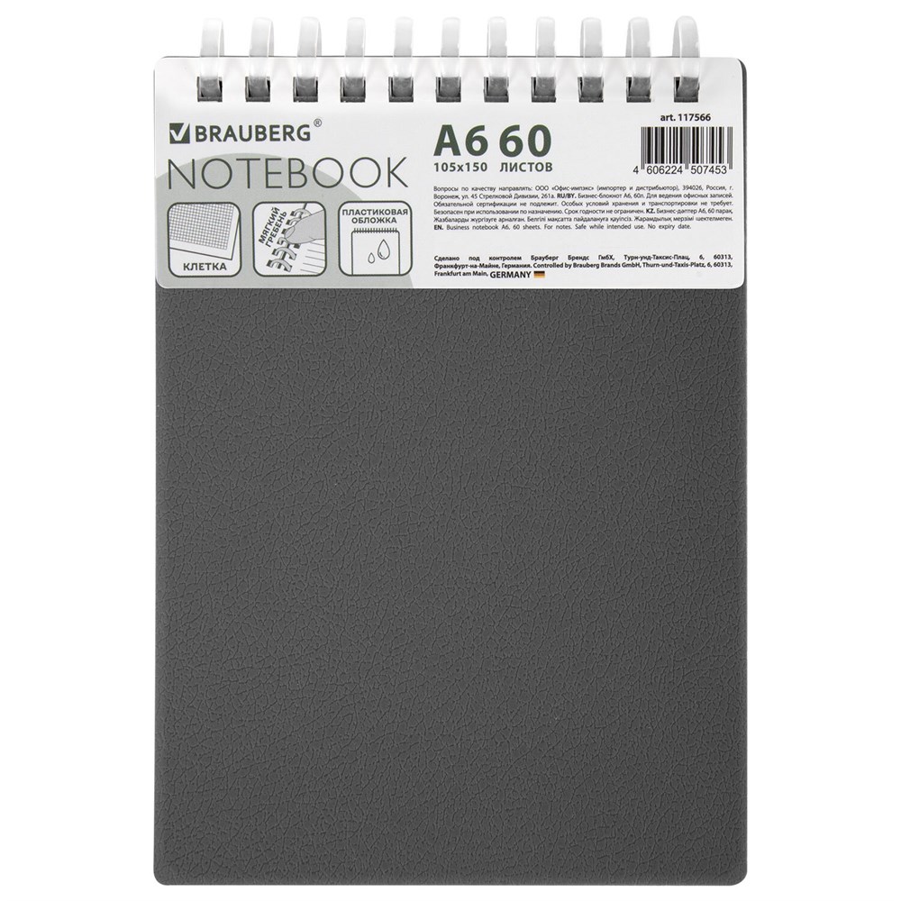 Блокнот МАЛЫЙ ФОРМАТ А6, 60 л., силиконовый гребень, обложка пластик, клетка, BRAUBERG, серый, 117566
