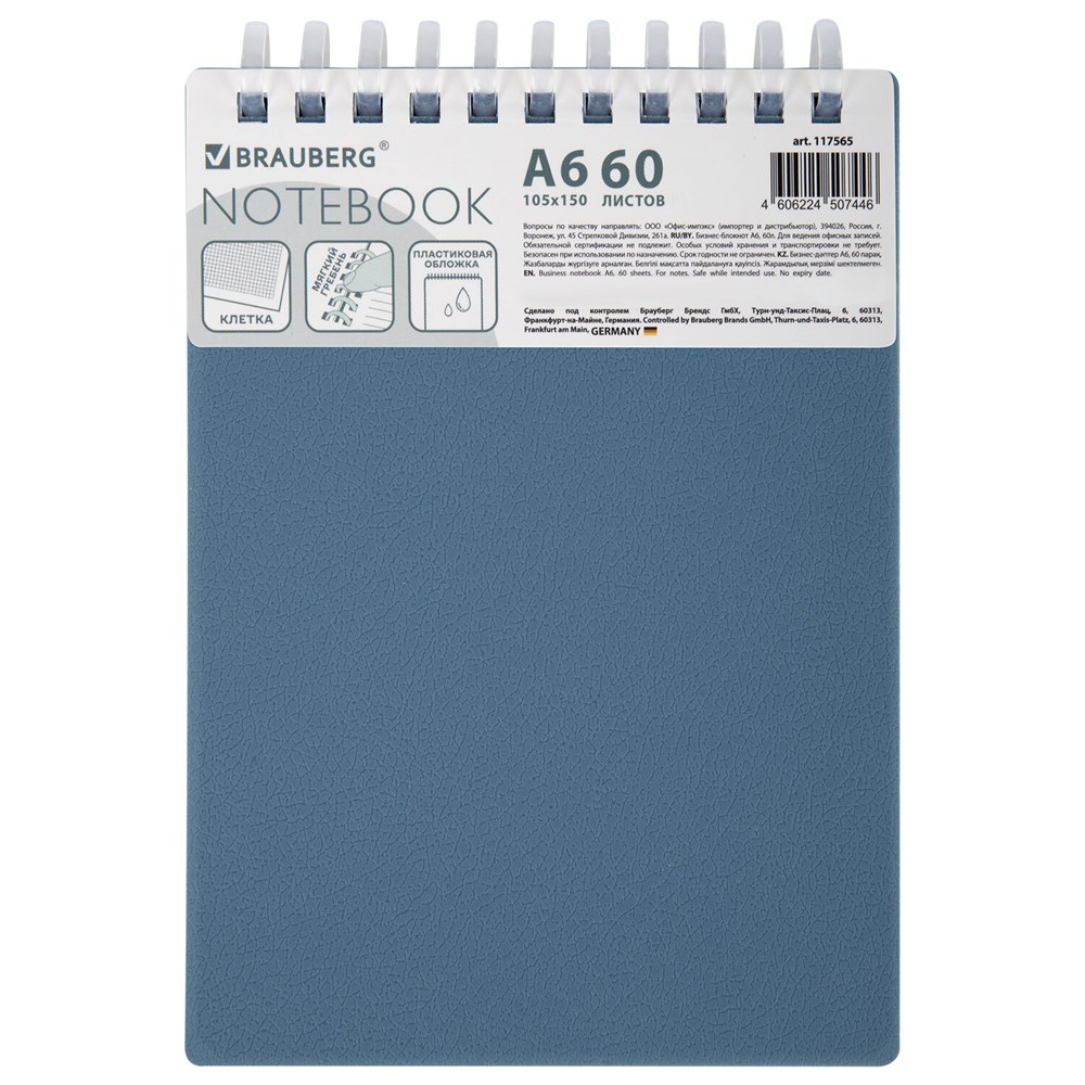 Блокнот МАЛЫЙ ФОРМАТ А6, 60 л., силиконовый гребень, обложка пластик, клетка, BRAUBERG, синий, 117565
