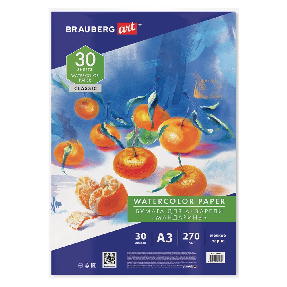 Бумага для акварели А3, 30 л., 270 г/м2, мелкое зерно, BRAUBERG ART CLASSIC, "Мандарины", 114402