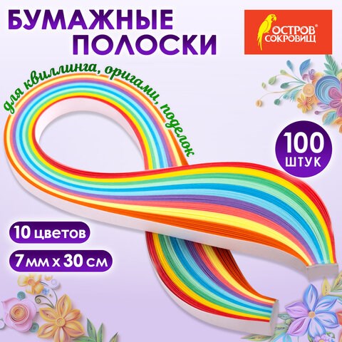 Бумага для квиллинга "Радуга", 10 цветов, 100 полос, 7 мм х 300 мм, 80 г/м2, ОСТРОВ СОКРОВИЩ, 128755