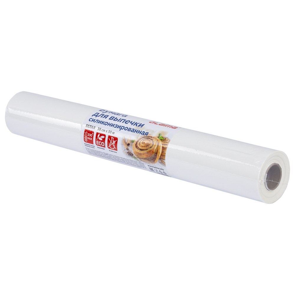 Бумага для выпечки характеризуется высокой степенью жиростойкости и влагостойкости, не прилипает к тесту и форме, а также предотвращает пригорание. Выдерживает температуру до 230 °С. Подходит для многоразового использования. Плотность – 35 г/м2. Размер рулона – 38 см x 50 м.
