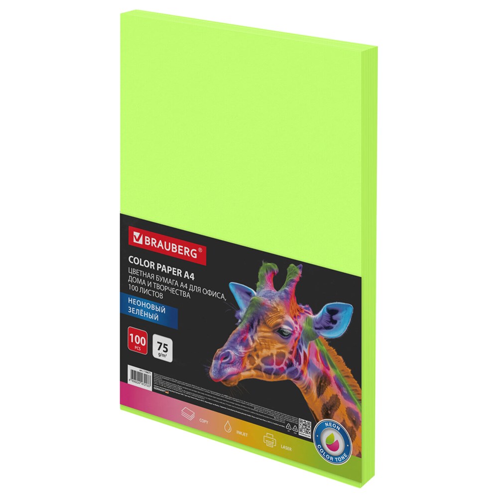 Бумага цветная BRAUBERG, А4, 75 г/м2, 100 л., НЕОН, зеленая, для офисной техники, 116671