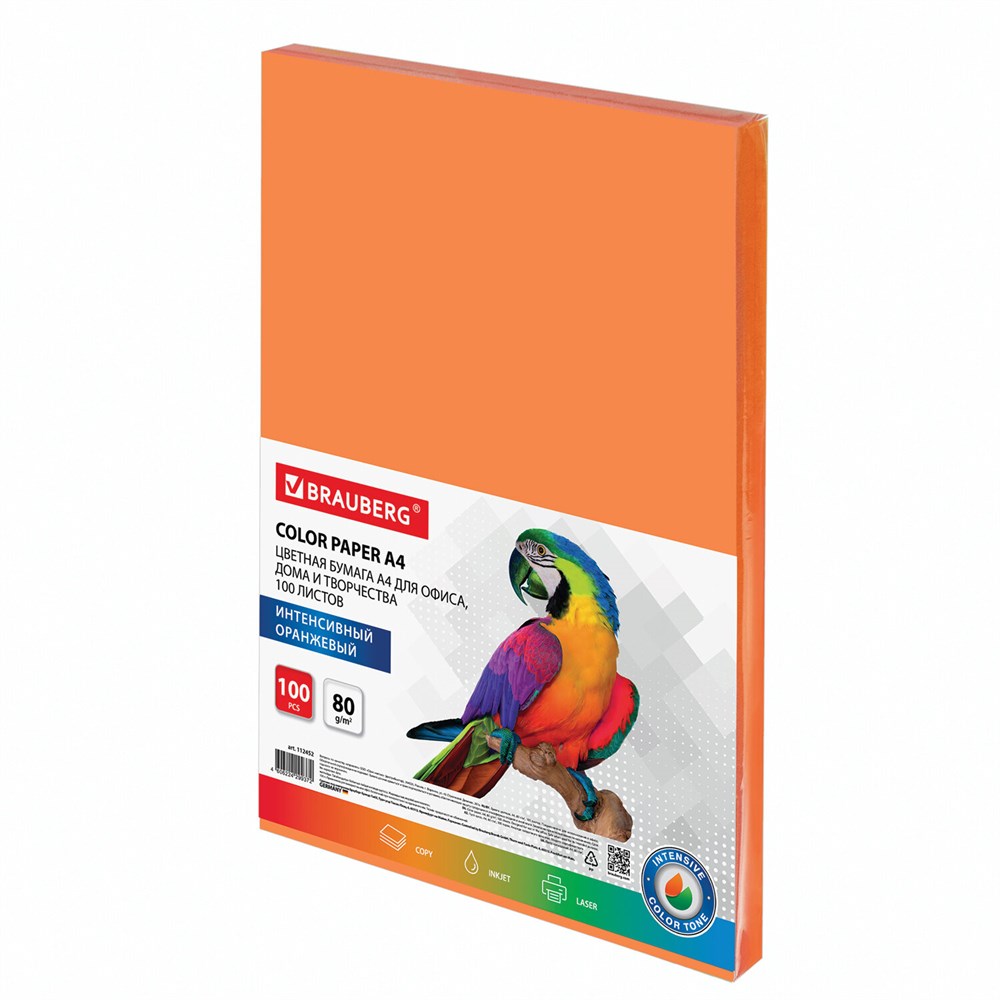 Бумага цветная BRAUBERG, А4, 80 г/м2, 100 л., интенсив, оранжевая, для офисной техники, 112452