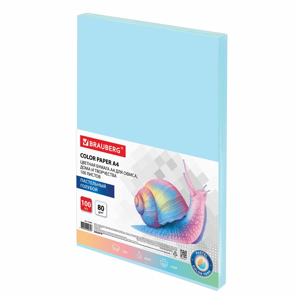 Бумага цветная BRAUBERG, А4, 80 г/м2, 100 л., пастель, голубая, для офисной техники, 112445