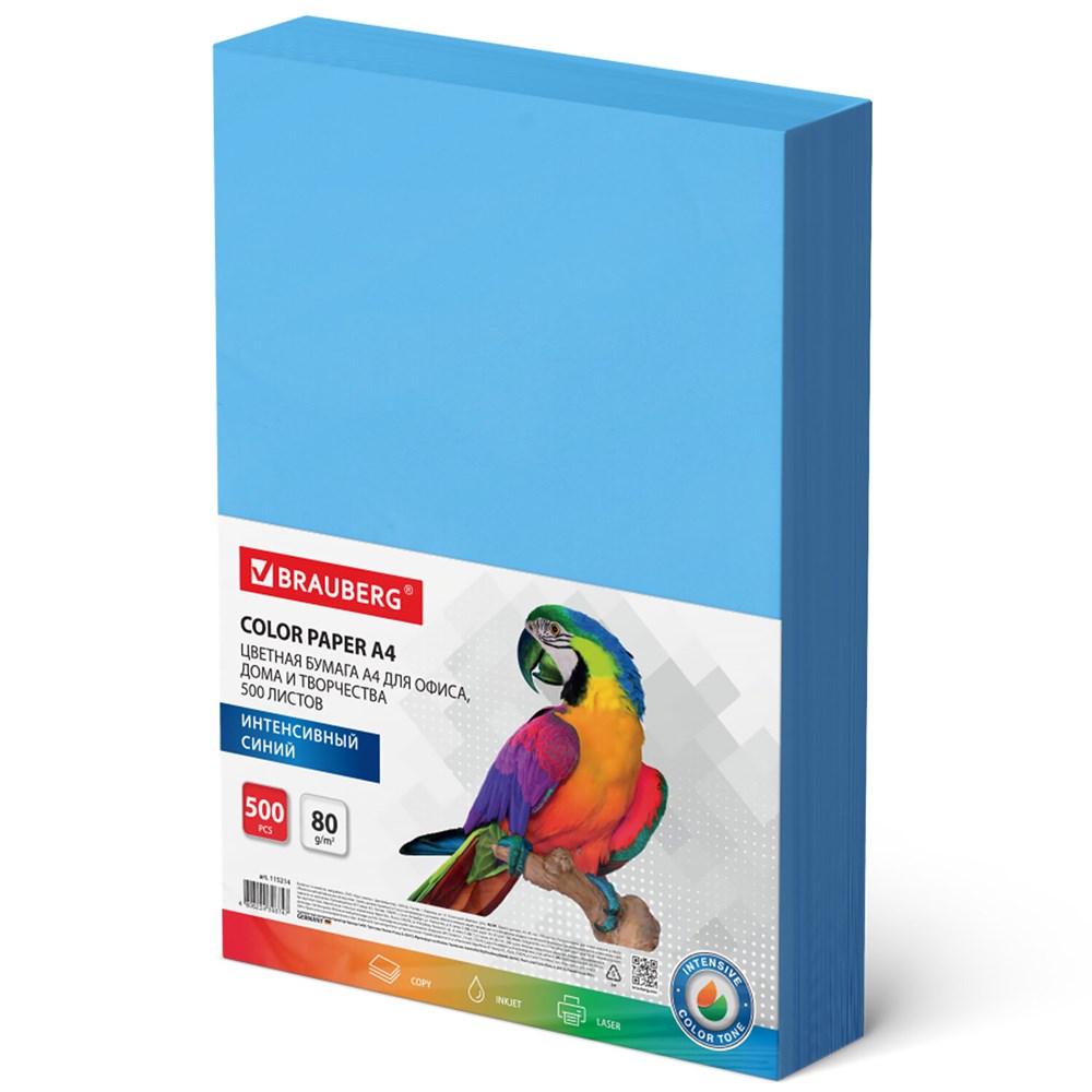 Бумага цветная BRAUBERG, А4, 80 г/м2, 500 л., интенсив, синяя, для офисной техники, 115214