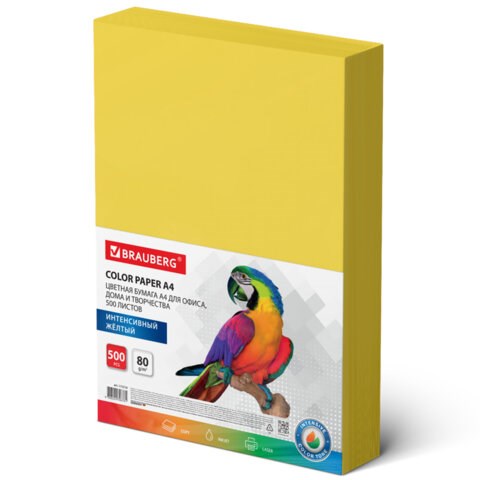 Бумага цветная BRAUBERG, А4, 80 г/м2, 500 л., интенсив, желтая, для офисной техники
