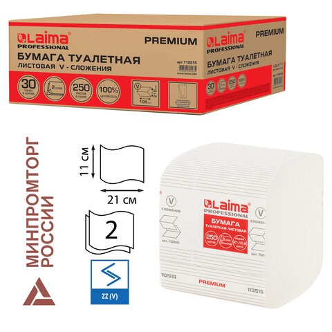 Бумага туалетная листовая 250 шт., LAIMA (Система T3) PREMIUM, 2-слойная, белая, 21х11 см, КОМПЛЕКТ 30 пачек, 112515