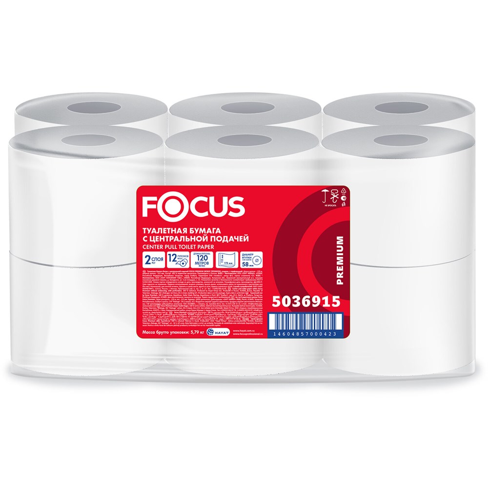 Бумага туалетная с центральной вытяжкой 120 м, FOCUS (T8) Premium, 2-слойная, белый, КОМПЛЕКТ 12 рулонов, 5036915