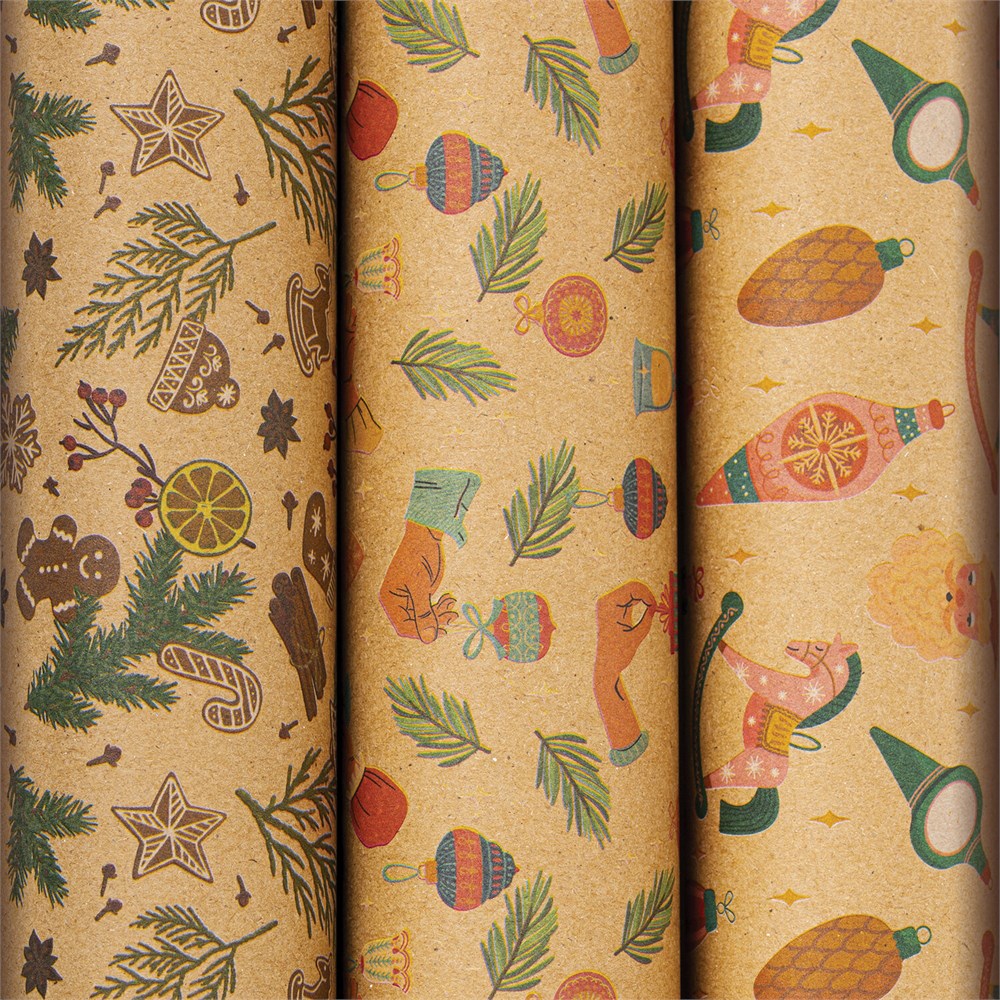 В нашем наборе вы найдёте 3 рулона бумаги размером 70х100 см, каждый из которых выполнен в красивом новогоднем дизайне с ярким эффектом. Все рулоны изготовлены из крафт-бумаги плотностью 105 г/м2.