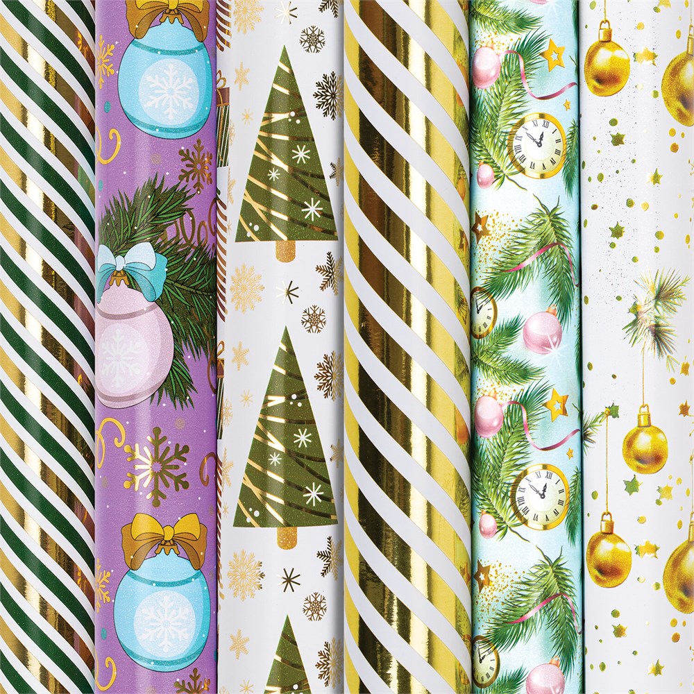 В данном коде представлены 6 дизайнов бумаги с переливающимся эффектом. Каждый рулон имеет размер 70х100 см. Представляет собой легкомелованную бумагу с нанесенной на нее металлизированной плёнкой с новогодним дизайном, за счёт которой и достигается красивый переливающийся эффект. Итоговая плотность бумаги – 78 г/м2. Каждый лист бумаги намотан на картонную втулку для лучшей сохранности бумаги в процессе транспортировки. Каждый рулон также упакован в термоусадочную пленку.