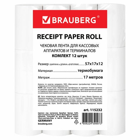 )Чековая лента BRAUBERG применяется для кассовых аппаратов, платежных терминалов самообслуживания, банкоматов и т.п. Изготовлена на современном оборудовании, обеспечивающем ровную намотку и отсутствие бумажной пыли.