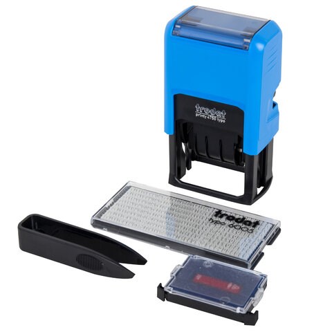 )Позволяет произвести оттиск даты и двух строк текста. Дата изменяется вращением колесика. Текст набирается из кассы шрифта, входящей в комплект.
