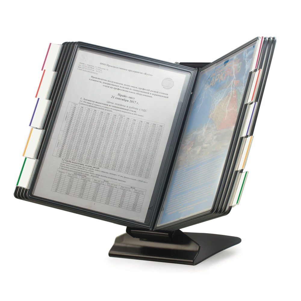 Настольная демонстрационная система BRAUBERG позволяет удобно и быстро разместить информацию о компании, о предлагаемых товарах, услугах и ценах, инструкции для персонала и др.10 двухсторонних панелей серого цвета позволяют разместить одновременно до 20 листов формата А4. Прочные и гибкие литые рамки панелей изготовлены из полипропилена, пригодного для повторной переработки и дальнейшего использования. Демопанели оснащены съемными ярлычками-табуляторами для маркировки и удобного поиска нужной информации. Карман демопанели из прочного прозрачного материала с антибликовым покрытием надежно защитит документы от внешних воздействий. Наклонное расположение панелей и устойчивое металлическое основание гарантируют удобство пользователю и быстрый доступ к документу. Возможно настенное размещение.Стильный черный цвет металлического корпуса подойдёт для большинства современных интерьеров.