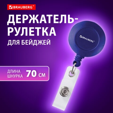 Держатель-рулетка для бейджей, 70 см, петелька, клип, синий, в блистере, BRAUBERG, 235727