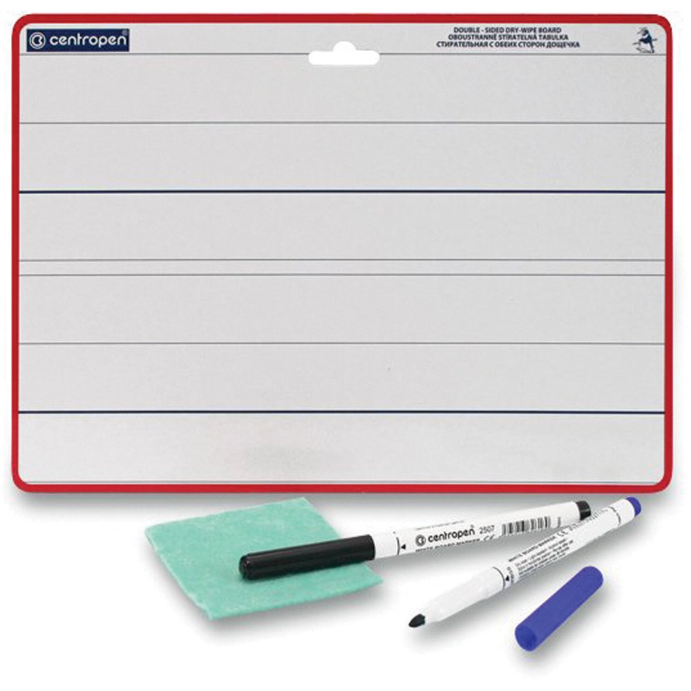 Идеальное решение для учебы и творчества – компактная доска CENTROPEN с двумя рабочими поверхностями, которая станет незаменимым помощником в повседневных задачах!Двусторонняя маркерная доска формата А4 с расчерченными линиями строк и нижними вспомогательными линиями. В комплекте есть 2 маркера для доски и салфетка для удаления надписей.