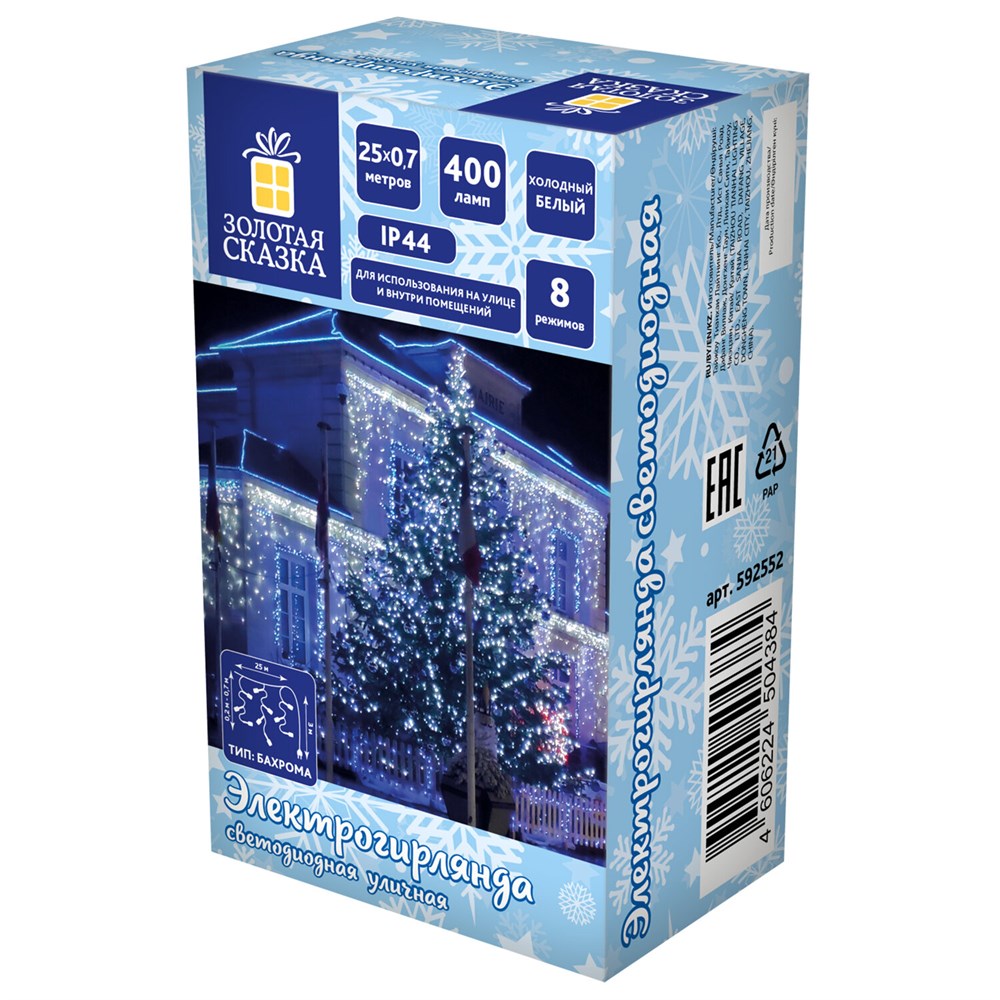 Электрогирлянда-бахрома уличная 25х0,7 м, 400 LED, холодный белый, 220 V, контроллер, ЗОЛОТАЯ СКАЗКА, 592552