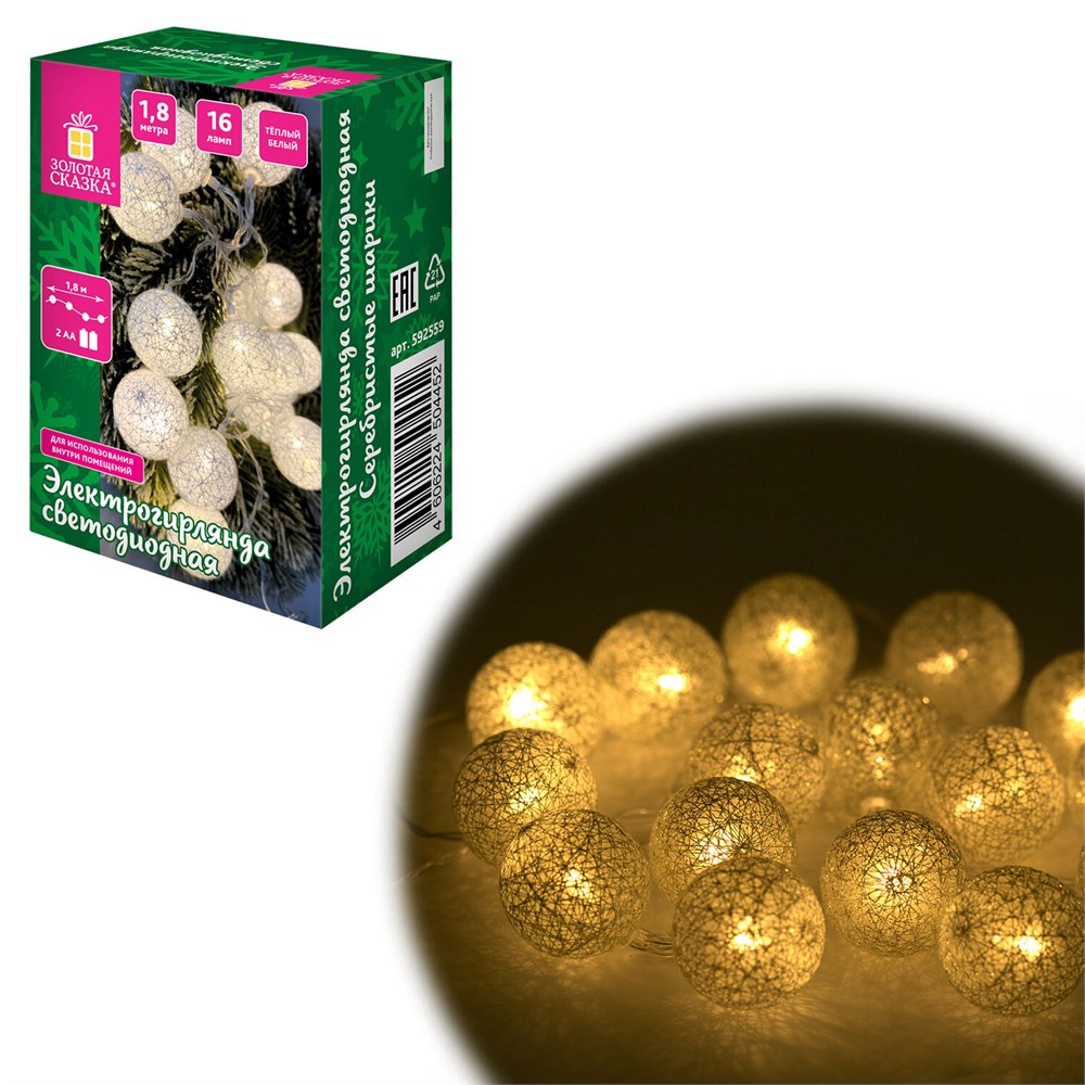 Электрогирлянда-нить комнатная "Шарики" 1,8 м, 16 LED, серебро, тёплый белый, батарейки, ЗОЛОТАЯ СКАЗКА, 592559