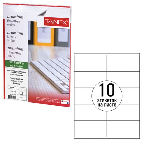 Этикетка самоклеящаяся 105х57 мм, 10 этикеток, белая, 70 г/м2, 50 листов, TANEX, сырье Финляндия, 114532, TW-2610