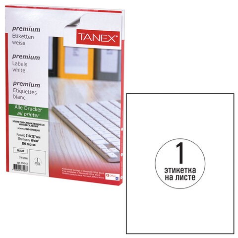Этикетка самоклеящаяся 210х297 мм, 1 этикетка, белая, 70 г/м2, 100 листов, TANEX, сырье Финляндия, 114543, TW-2000