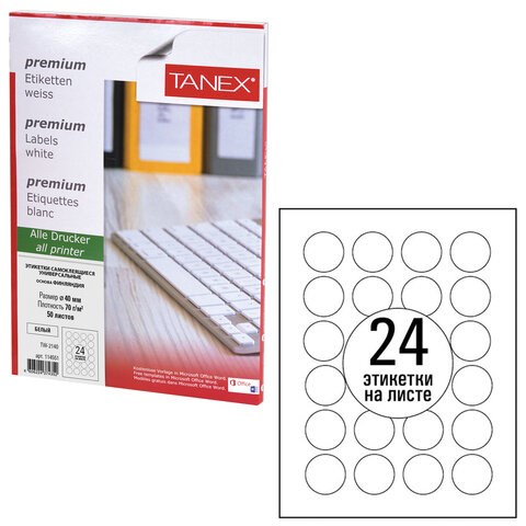 Этикетка самоклеящаяся D40 мм, 24 этикетки, белая, 70 г/м2, 50 листов, TANEX, сырье Финляндия, 114551, TW-2140