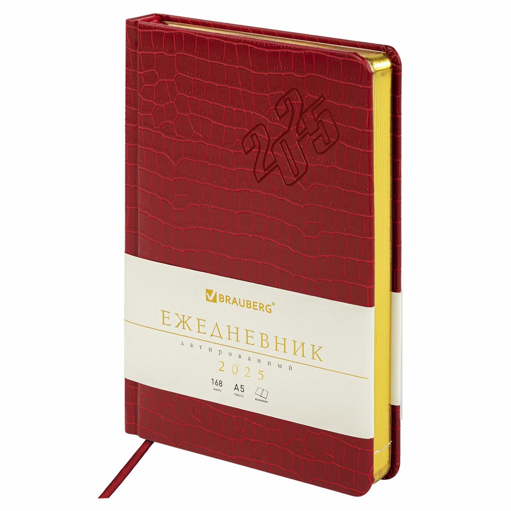 Датированный ежедневник BRAUBERG "Comodo" с обложкой, стилизованной под кожу крокодила, выглядит очень изысканным. Внутренний блок включает 168 листов тонированной бумаги плотностью 70 г/м2. Каждая страничка имеет перфорированный угол. Благодаря стандартному формату А5 (138х213 мм) ежедневник удобно использовать как в офисе, так и на выездных деловых встречах. Материал обложки насыщенного красного цвета подходит для горячего тиснения. Срез ежедневника фольгирован золотой фольгой, что придает ему особый шарм.