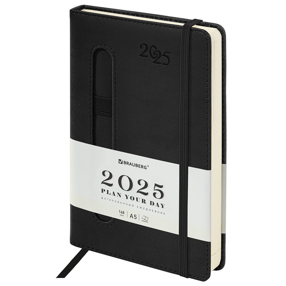 Ежедневник датированный 2025 А5 138x213 мм, BRAUBERG "Optimal", под кожу, резинка-фиксатор, держатель для ручки, черный, 115892