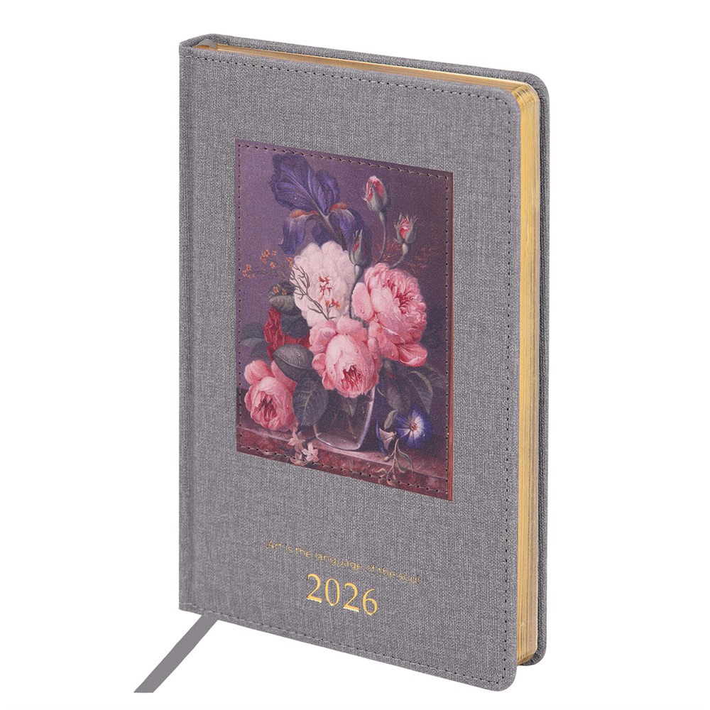 Ежедневник датированный 2026 А5 138х213 мм, BRAUBERG "ArtGallery", под кожу, нашивка, серый, 117406