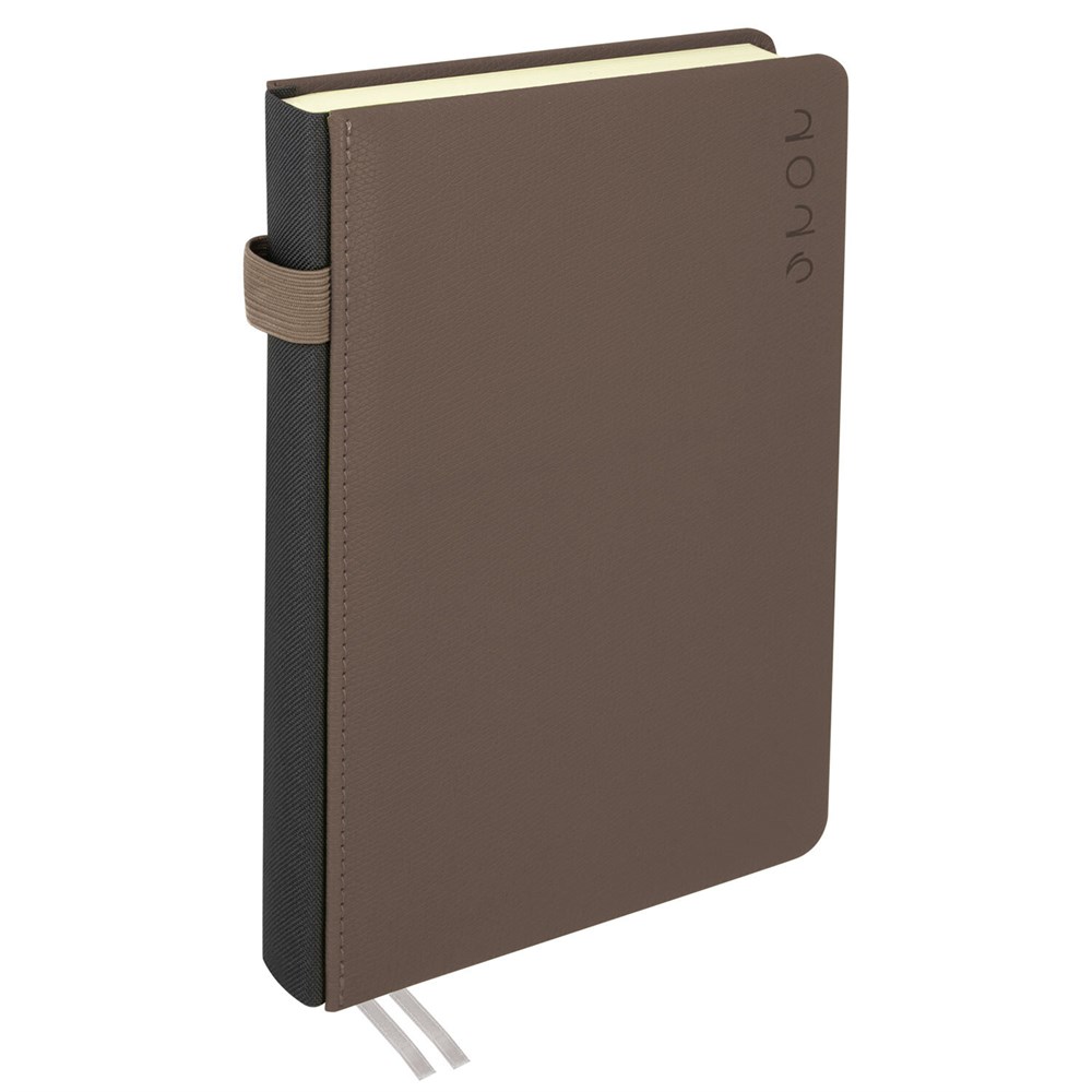 Твердая обложка стилизована под текстурную кожу и имеет интересную деталь в виде корешка контрастного цвета. Поверхность подходит для горячего тиснения. Ежедневник снабжён двумя закладками-ляссе и держателем для ручки. Справочный материал дополнительно расширяет функциональность ежедневника. В конце внутреннего блока есть 4 страницы для записей и заметок.
