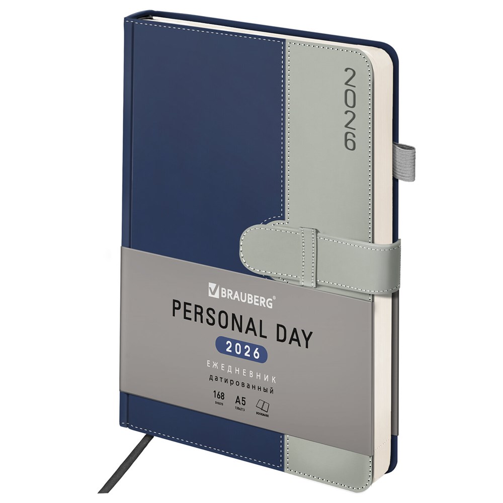 Ежедневник датированный 2026, А5, 138х213 мм, BRAUBERG "Esthetic", под кожу, держатель для ручки, застежка, синий/серый, 117373