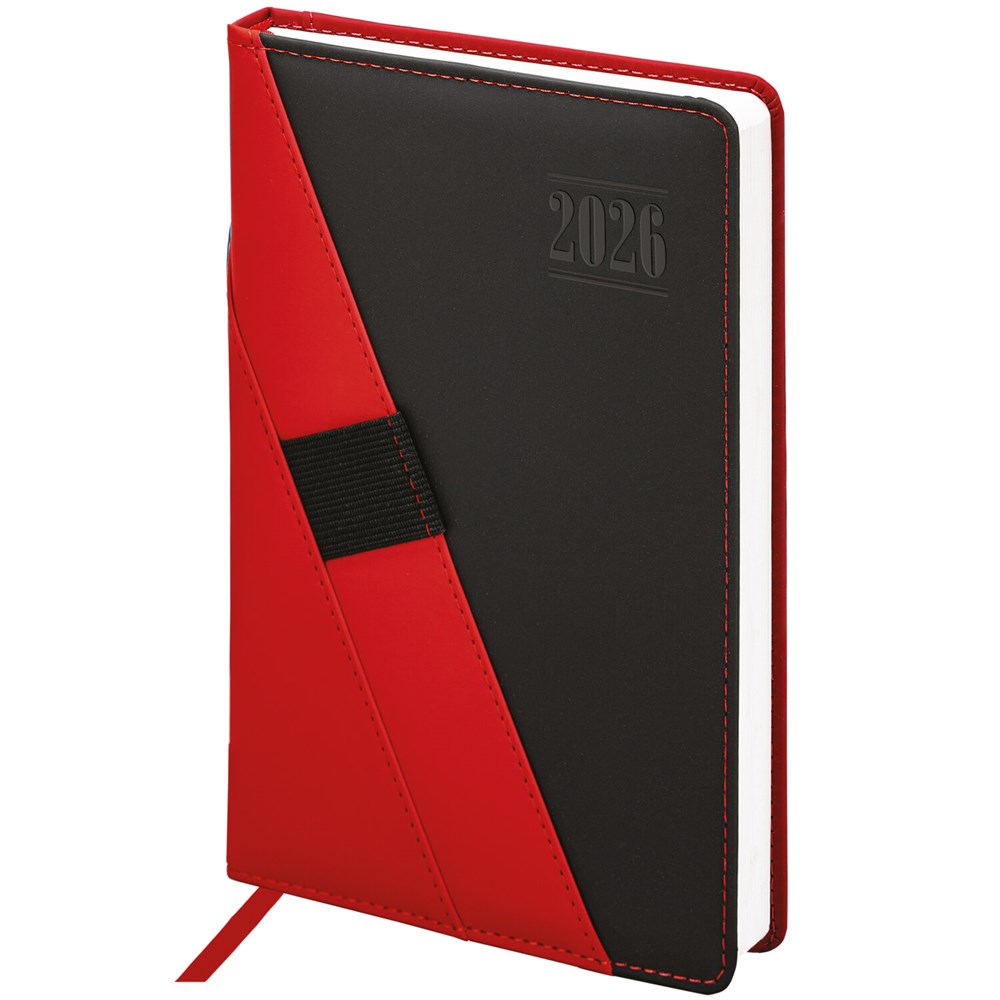Выполнен в стильном сочетании красного и черного цветов. Обложка подходит для горячего тиснения. Ежедневник снабжён закладкой-ляссе и держателем для ручки. Справочный материал дополнительно расширяет функциональность ежедневника. В конце внутреннего блока есть 4 страницы для записей и заметок.