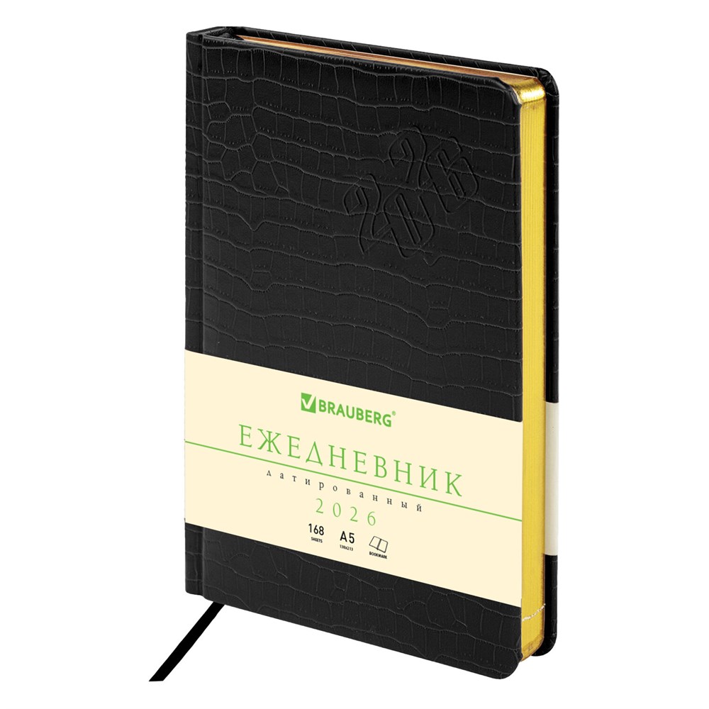 Датированный ежедневник BRAUBERG "Comodo" с обложкой, стилизованной под крокодиловую кожу, отличается изысканным внешним видом.Внутренний блок включает 168 листов тонированной бумаги плотностью 70 г/м2. Каждая страничка имеет перфорированный угол. Благодаря стандартному формату А5 (138х213 мм) ежедневник удобно использовать как в офисе, так и на выездных деловых встречах. Материал обложки черного цвета подходит для горячего тиснения. Срез ежедневника украшен золотым фольгированием – это подчеркивает премиальность изделия.